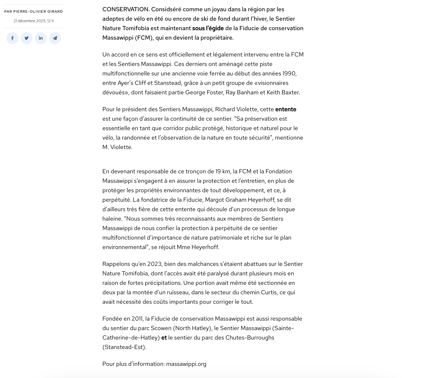 Le Sentier Tomifobia s’ajoute à la grande famille de la Fiducie de conservation Massawippi [Le Reflet du Lac]