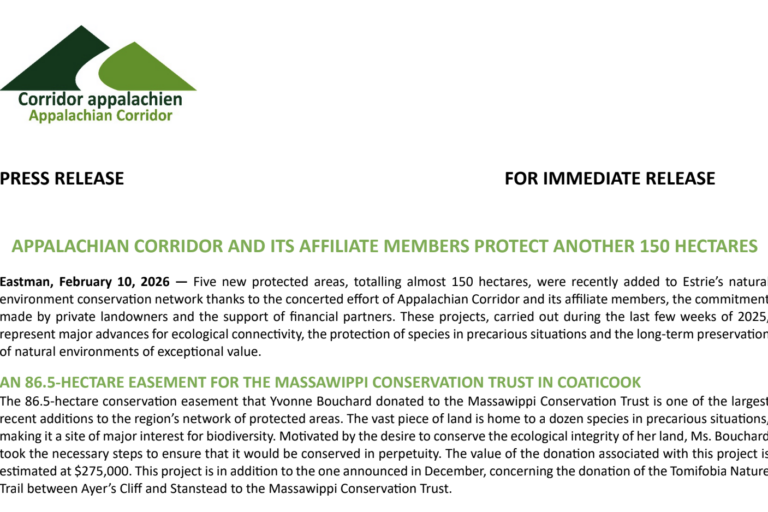 The Tomifobia Nature Trail, jewel of the Eastern Townships, is transferred to the Massawippi Conservation Trust Ayer’s Cliff, December 16, 2025 – Les Sentiers Massawippi and the Massawippi Conservation Trust (MCT) announce the transfer of the Tomifobia Nature Trail. The Tomifobia Nature Trail is a 19-km multi-purpose trail between Ayer’s Cliff and Stanstead. Les Sentiers…