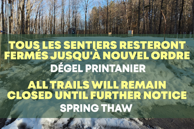 All trails will remain closed until further notice As of Tuesday, March 31st, please refrain from visiting the trails to avoid damage during the spring thaw. We will inform you about the reopening through all social media channels. Thank you very much for your cooperation.