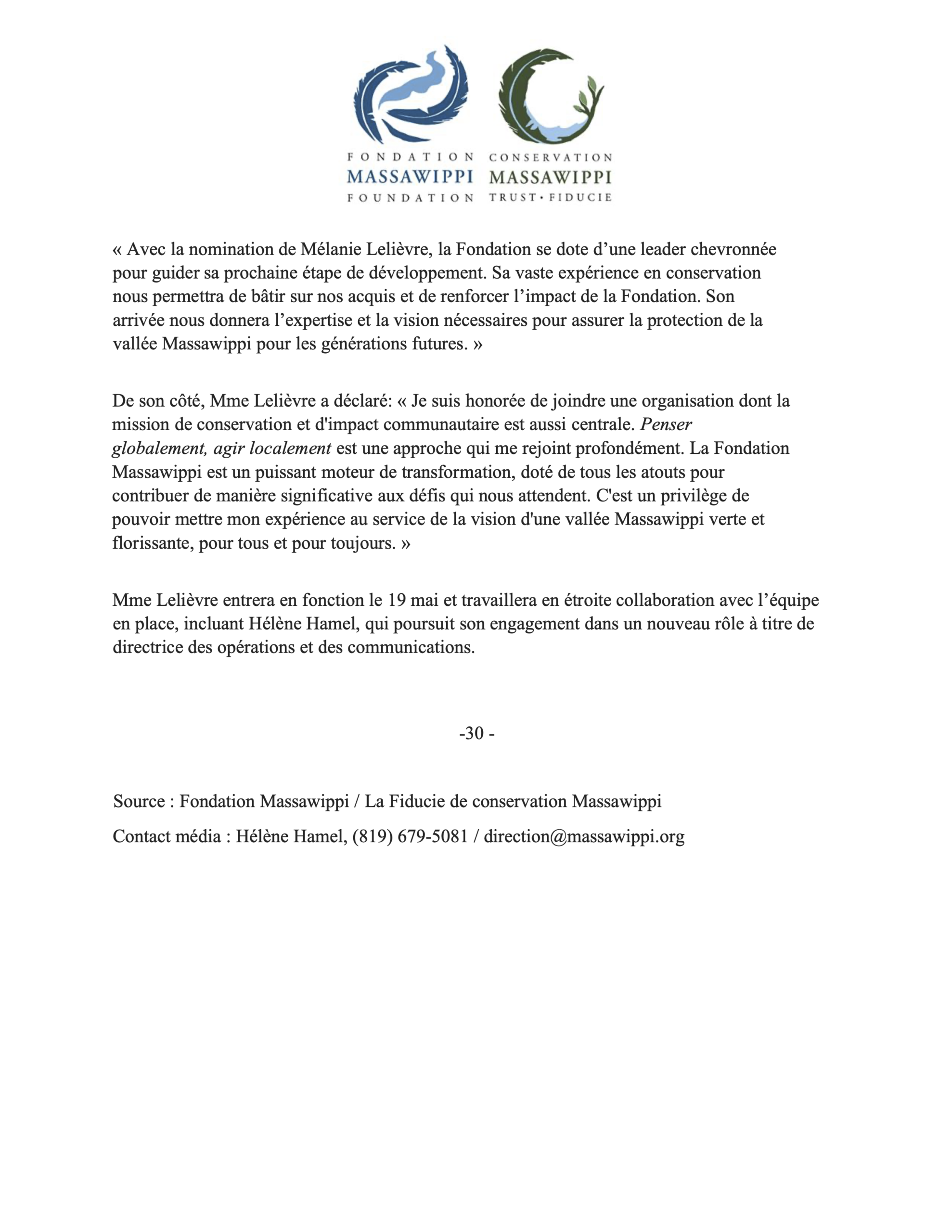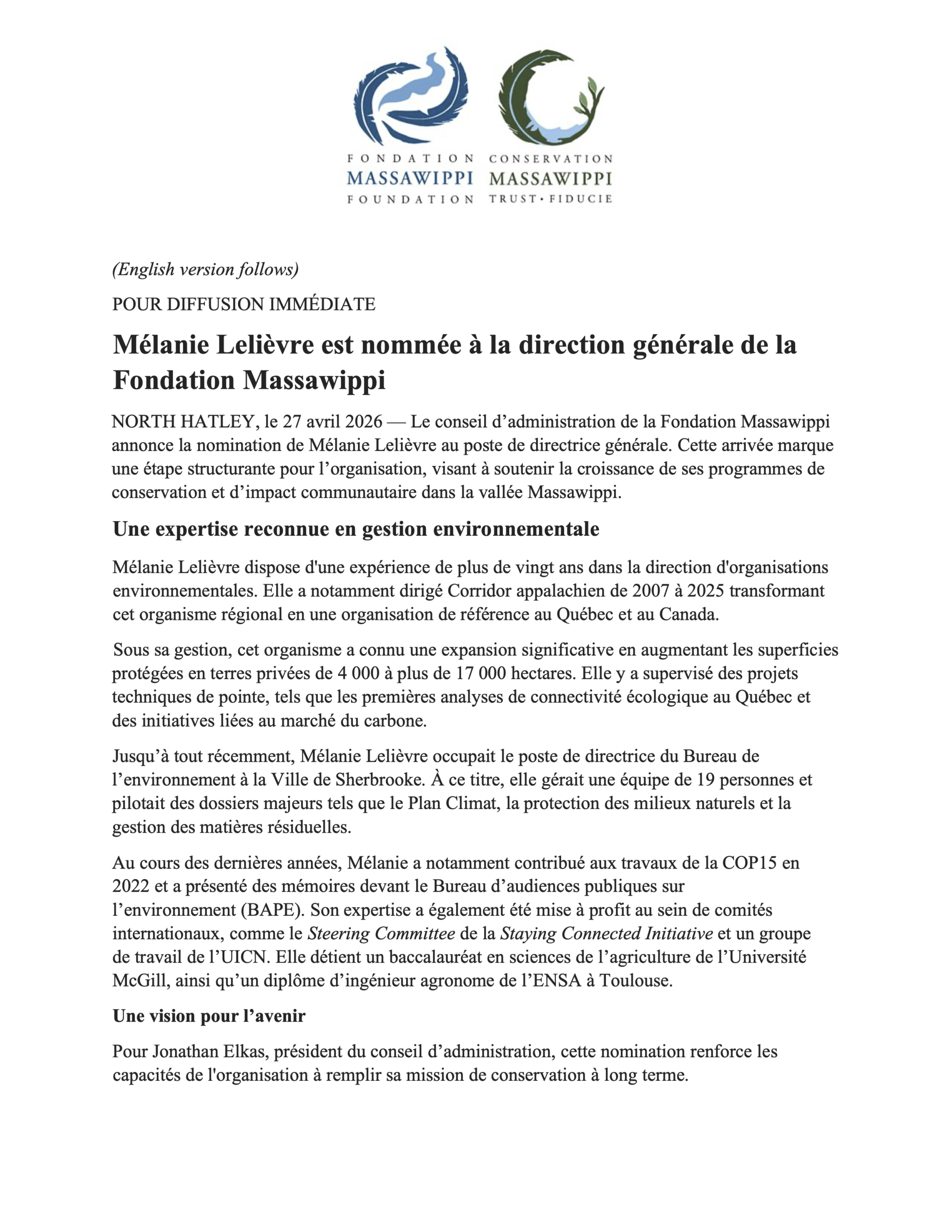 [POUR DIFFUSION IMMÉDIATE] Mélanie Lelièvre est nommée à la direction générale de la Fondation Massawippi